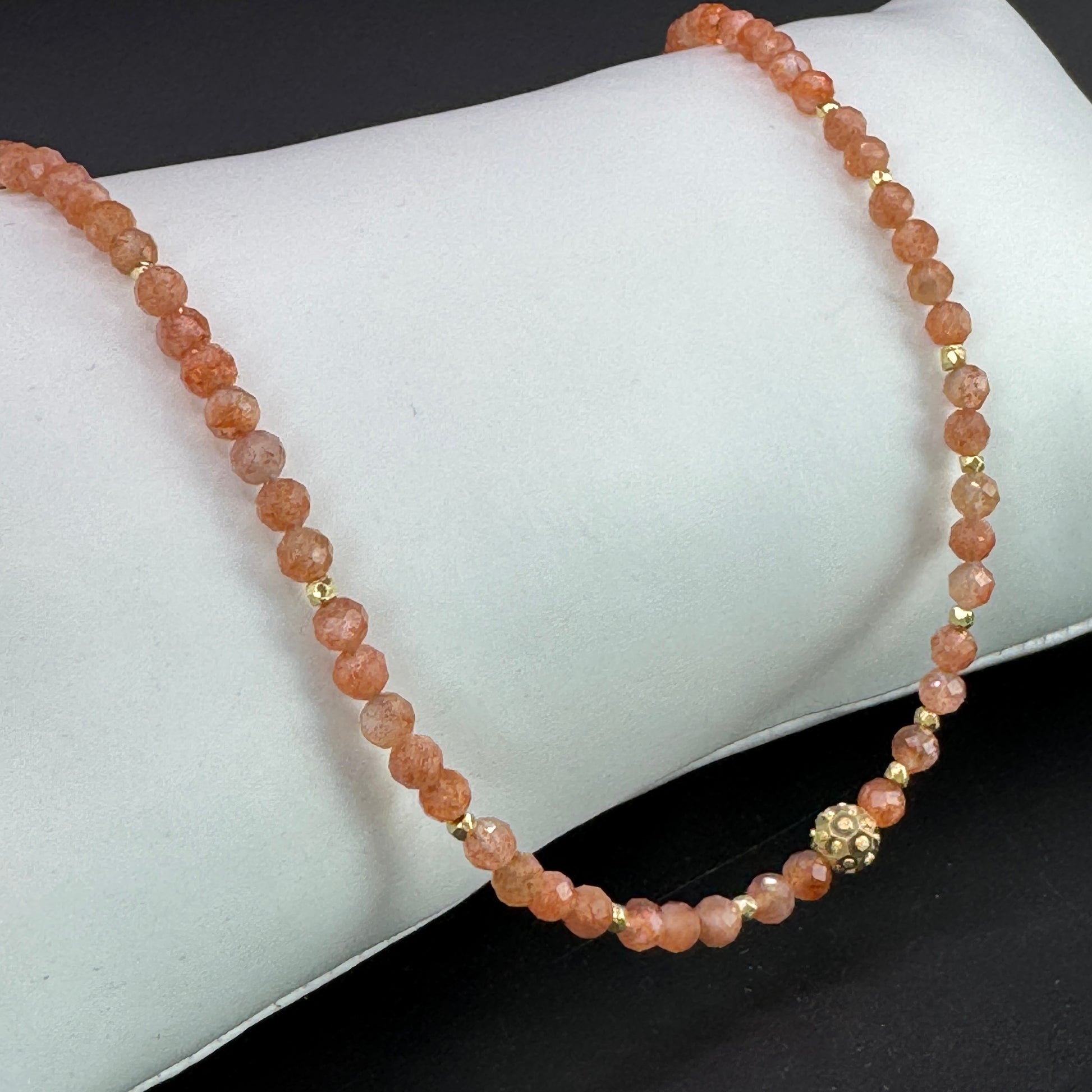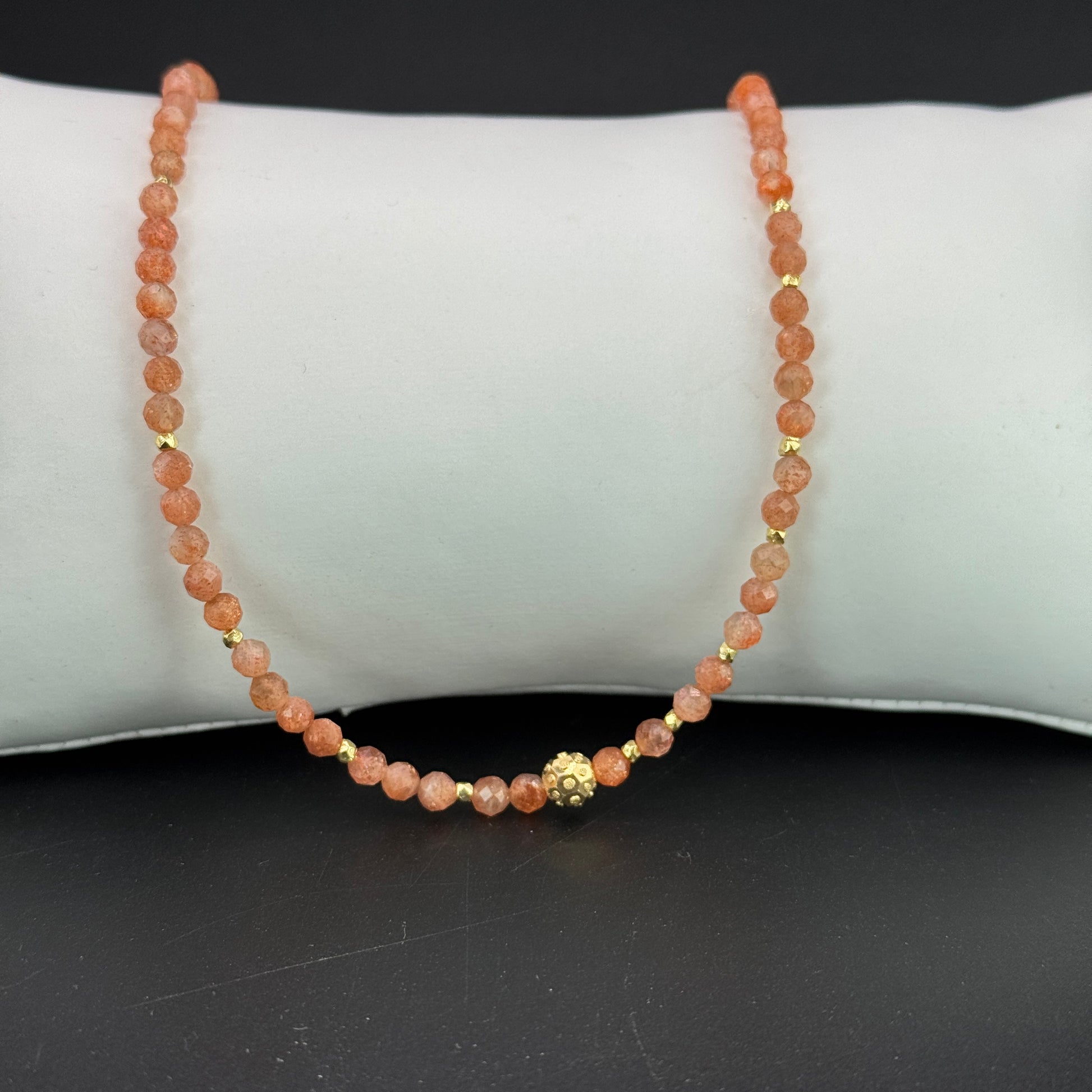 Warmer Schimmer, zartes Funkeln: facettierter Sonnenstein in bester Qualität, veredelt mit vergoldeten 925 Sterling-Silber-Perlen. In Wunschlänge & mit Verschluss nach Wahl.